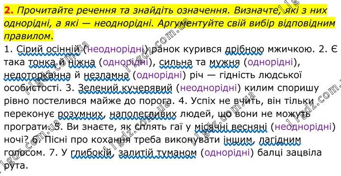 Прочитайте речення та знайдіть означення. Визначте, які з них однорідні, а які — неоднорідні. Аргументуйте свій вибір відповідним правилом. 1. Сірий осінній (неоднорідні) ранок курився дрібною мжичкою. 2. Є така тонка й ніжна (однорідні), сильна та мужня (однорідні), недоторканна й незламна (однорідні) річ — гідність людської особистості. 3. Зелений кучерявий (неоднорідні) килим споришу рівно постелився майже до порога. 4. Успіх не вчить, він тільки переконує розумних, наполегливих людей, що вони не можуть програти. 5. Ви знаєте, як сплять гаї у місячні весняні (неоднорідні) ночі? 6. Пісні про кохання треба виконувати іншим, лагідним голосом. 7. У глибокій, залитій туманом (однорідні) балці зацвіла рута.