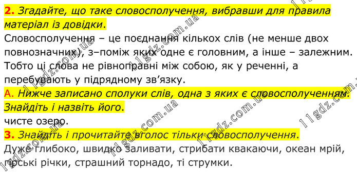 2. Згадайте, що таке словосполучення, вибравши для правила матеріал із довідки. Словосполучення – це поєднання кількох слів (не менше двох повнозначних), з–поміж яких одне є головним, а інше – залежним. Тобто ці слова не рівноправні між собою, як у реченні, а перебувають у підрядному зв’язку. А. Нижче записано сполуки слів, одна з яких є словосполученням. Знайдіть і назвіть його. чисте озеро. 3. Знайдіть і прочитайте вголос тільки словосполучення. Дуже глибоко, швидко заливати, стрибати квакаючи, океан мрій, гірські річки, страшний торнадо, ті струмки.