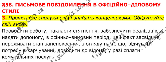 §58. ПИСЬМОВЕ ПОВІДОМЛЕННЯ В ОФІЦІЙНО–ДІЛОВОМУ СТИЛІ 3. Прочитайте сполуки слів і знайдіть канцеляризми. Обґрунтуйте свій вибір. Проводити роботу, накласти стягнення, забезпечити реалізацію, надати допомогу, в осінньо–зимовий період, цей факт засвідчує, переживати стан занепокоєння, з огляду на те що, відчувати потребу в харчуванні, доводити до відома, у разі сплати комунальних послуг.