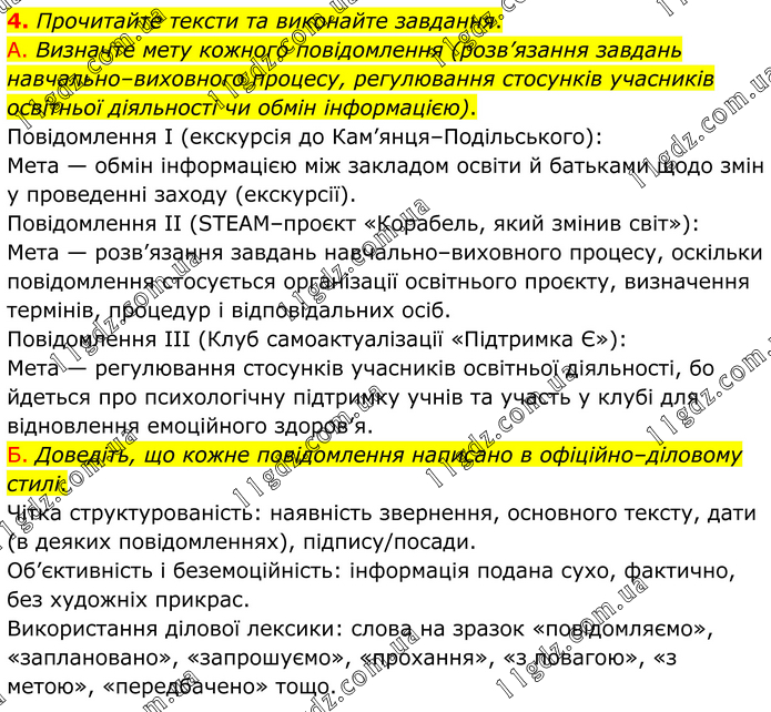 Прочитайте тексти та виконайте завдання. А. Визначте мету кожного повідомлення (розв’язання завдань навчально–виховного процесу, регулювання стосунків учасників освітньої діяльності чи обмін інформацією). Повідомлення І (екскурсія до Кам’янця–Подільського): Мета — обмін інформацією між закладом освіти й батьками щодо змін у проведенні заходу (екскурсії). Повідомлення ІІ (STEAM–проєкт «Корабель, який змінив світ»): Мета — розв’язання завдань навчально–виховного процесу, оскільки повідомлення стосується організації освітнього проєкту, визначення термінів, процедур і відповідальних осіб. Повідомлення ІІІ (Клуб самоактуалізації «Підтримка Є»): Мета — регулювання стосунків учасників освітньої діяльності, бо йдеться про психологічну підтримку учнів та участь у клубі для відновлення емоційного здоров’я. Б. Доведіть, що кожне повідомлення написано в офіційно–діловому стилі. Чітка структурованість: наявність звернення, основного тексту, дати (в деяких повідомленнях), підпису/посади. Об’єктивність і беземоційність: інформація подана сухо, фактично, без художніх прикрас. Використання ділової лексики: слова на зразок «повідомляємо», «заплановано», «запрошуємо», «прохання», «з повагою», «з метою», «передбачено» тощо.