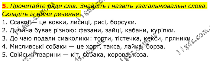 Прочитайте ряди слів. Знайдіть і назвіть узагальнювальні слова. Складіть із ними речення. 1. Ссавці — це вовки, лисиці, рисі, борсуки. 2. Дичина буває різною: фазани, зайці, кабани, куріпки. 3. До чаю подали смаколики: торти, тістечка, кекси, пряники 4. Мисливські собаки — це хорт, такса, лайка, борза. 5. Свійські тварини — кіт, собака, корова, коза.