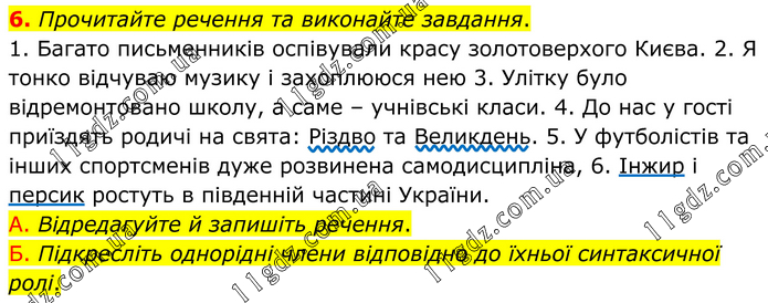 Прочитайте речення та виконайте завдання. 1. Багато письменників оспівували красу золотоверхого Києва. 2. Я тонко відчуваю музику і захоплююся нею 3. Улітку було відремонтовано школу, а саме – учнівські класи. 4. До нас у гості приїздять родичі на свята: Різдво та Великдень. 5. У футболістів та інших спортсменів дуже розвинена самодисципліна, 6. Інжир і персик ростуть в південній частині України. А. Відредагуйте й запишіть речення. Б. Підкресліть однорідні члени відповідно до їхньої синтаксичної ролі.