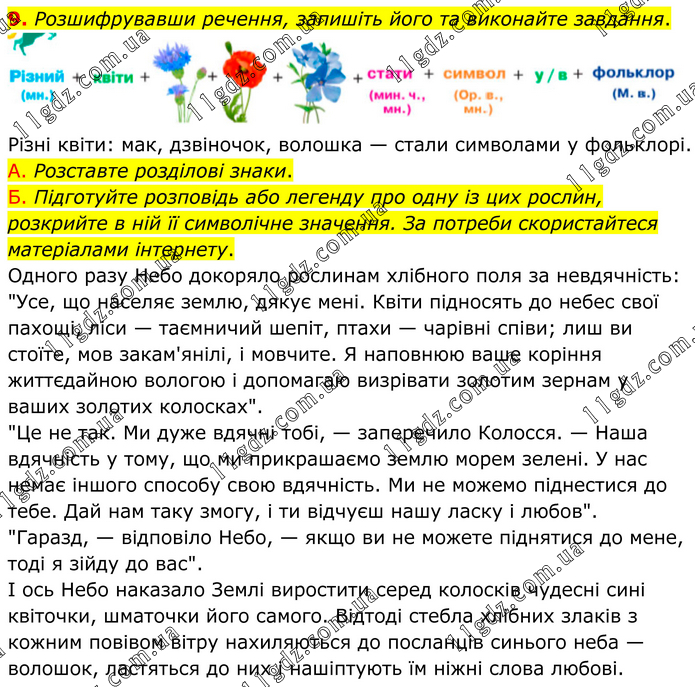 Розшифрувавши речення, запишіть його та виконайте завдання. Різні квіти: мак, дзвіночок, волошка — стали символами у фольклорі. А. Розставте розділові знаки. Б. Підготуйте розповідь або легенду про одну із цих рослин, розкрийте в ній її символічне значення. За потреби скористайтеся матеріалами інтернету. Одного разу Небо докоряло рослинам хлібного поля за невдячність: "Усе, що населяє землю, дякує мені. Квіти підносять до небес свої пахощі, ліси — таємничий шепіт, птахи — чарівні співи; лиш ви стоїте, мов закам'янілі, і мовчите. Я наповнюю ваше коріння життєдайною вологою і допомагаю визрівати золотим зернам у ваших золотих колосках". "Це не так. Ми дуже вдячні тобі, — заперечило Колосся. — Наша вдячність у тому, що ми прикрашаємо землю морем зелені. У нас немає іншого способу свою вдячність. Ми не можемо піднестися до тебе. Дай нам таку змогу, і ти відчуєш нашу ласку і любов". "Гаразд, — відповіло Небо, — якщо ви не можете піднятися до мене, тоді я зійду до вас". І ось Небо наказало Землі виростити серед колосків чудесні сині квіточки, шматочки його самого. Відтоді стебла хлібних злаків з кожним повівом вітру нахиляються до посланців синього неба — волошок, ластяться до них і нашіптують їм ніжні слова любові.