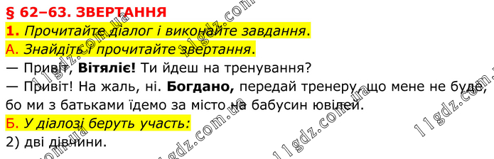 § 62–63. ЗВЕРТАННЯ 1. Прочитайте діалог і виконайте завдання. А. Знайдіть і прочитайте звертання. — Привіт, Вітяліє! Ти йдеш на тренування? — Привіт! На жаль, ні. Богдано, передай тренеру, що мене не буде, бо ми з батьками їдемо за місто на бабусин ювілей. Б. У діалозі беруть участь: 2) дві дівчини.