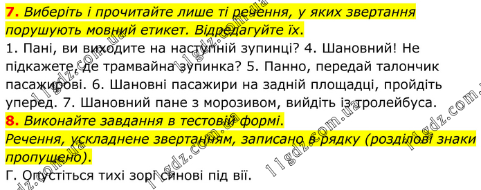 7. Виберіть і прочитайте лише ті речення, у яких звертання порушують мовний етикет. Відредагуйте їх. 1. Пані, ви виходите на наступній зупинці? 4. Шановний! Не підкажете, де трамвайна зупинка? 5. Панно, передай талончик пасажирові. 6. Шановні пасажири на задній площадці, пройдіть уперед. 7. Шановний пане з морозивом, вийдіть із тролейбуса. 8. Виконайте завдання в тестовій формі. Речення, ускладнене звертанням, записано в рядку (розділові знаки пропущено). Г. Опустіться тихі зорі синові під вії.