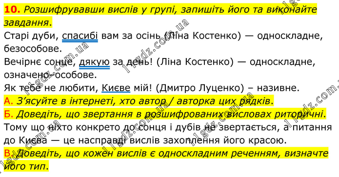 10. Розшифрувавши вислів у групі, запишіть його та виконайте завдання. Старі дуби, спасибі вам за осінь (Ліна Костенко) — односкладне, безособове. Вечірнє сонце, дякую за день! (Ліна Костенко) — односкладне, означено–особове. Як тебе не любити, Києве мій! (Дмитро Луценко) – називне. A. З’ясуйте в інтернеті, хто автор / авторка цих рядків. Б. Доведіть, що звертання в розшифрованих висловах риторичні. Тому що ніхто конкрето до сонця і дубів не звертається, а питання до Києва — це насправді вислів захоплення його красою. B. Доведіть, що кожен вислів є односкладним реченням, визначте його тип.