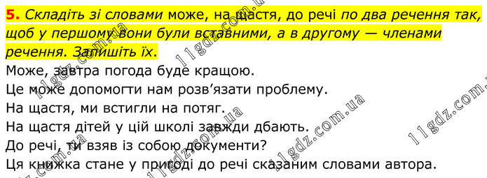Складіть зі словами може, на щастя, до речі по два речення так, щоб у першому вони були вставними, а в другому — членами речення. Запишіть їх. Може, завтра погода буде кращою. Це може допомогти нам розв’язати проблему. На щастя, ми встигли на потяг. На щастя дітей у цій школі завжди дбають. До речі, ти взяв із собою документи? Ця книжка стане у пригоді до речі сказаним словами автора.