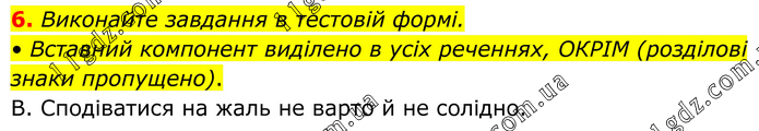 Виконайте завдання в тестовій формі. • Вставний компонент виділено в усіх реченнях, ОКРІМ (розділові знаки пропущено). В. Сподіватися на жаль не варто й не солідно.