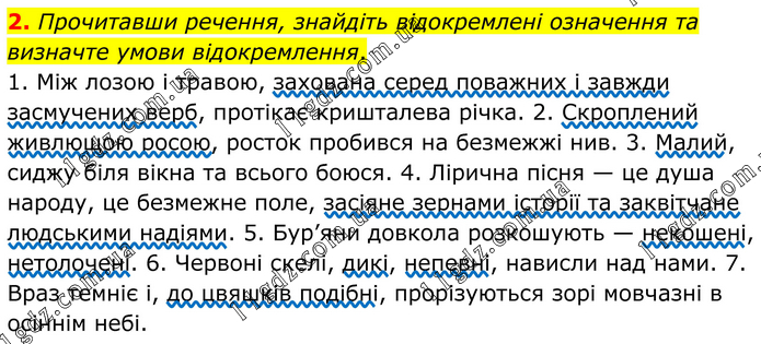 Прочитавши речення, знайдіть відокремлені означення та визначте умови відокремлення. 1. Між лозою і травою, захована серед поважних і завжди засмучених верб, протікає кришталева річка. 2. Скроплений живлющою росою, росток пробився на безмежжі нив. 3. Малий, сиджу біля вікна та всього боюся. 4. Лірична пісня — це душа народу, це безмежне поле, засіяне зернами історії та заквітчане людськими надіями. 5. Бур’яни довкола розкошують — некошені, нетолочені. 6. Червоні скелі, дикі, непевні, нависли над нами. 7. Враз темніє і, до цвяшків подібні, прорізуються зорі мовчазні в осіннім небі.