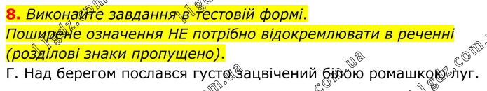 Виконайте завдання в тестовій формі. Поширене означення НЕ потрібно відокремлювати в реченні (розділові знаки пропущено). Г. Над берегом послався густо зацвічений білою ромашкою луг.