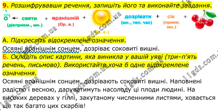 Розшифрувавши речення, запишіть його та виконайте завдання. А. Підкресліть відокремлене означення. Осяяні вранішнім сонцем, дозріває соковиті вишні. Б. Складіть опис картини, яка виникла у вашій уяві (три–п'ять речень, письмово). Використайте хоча б одне відокремлене означення. Осяяні вранішнім сонцем, дозрівають соковиті вишні. Наповнені радістю і весною, даруватимуть насолоду ці плоди людині. На високих деревах у гіллі, закутаному численними листями, ховається ще так багато цих скарбів!