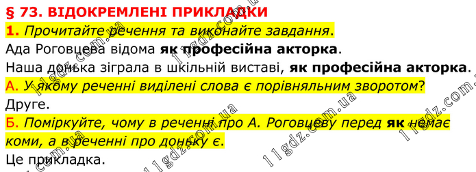 § 73. ВІДОКРЕМЛЕНІ ПРИКЛАДКИ 1. Прочитайте речення та виконайте завдання. Ада Роговцева відома як професійна акторка. Наша донька зіграла в шкільній виставі, як професійна акторка. А. У якому реченні виділені слова є порівняльним зворотом? Друге. Б. Поміркуйте, чому в реченні про А. Роговцеву перед як немає коми, а в реченні про доньку є. Це прикладка.