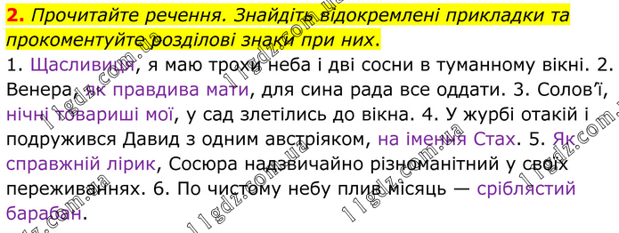 Прочитайте речення. Знайдіть відокремлені прикладки та прокоментуйте розділові знаки при них. 1. Щасливиця, я маю трохи неба і дві сосни в туманному вікні. 2. Венера, як правдива мати, для сина рада все оддати. 3. Солов’ї, нічні товариші мої, у сад злетілись до вікна. 4. У журбі отакій і подружився Давид з одним австріяком, на імення Стах. 5. Як справжній лірик, Сосюра надзвичайно різноманітний у своїх переживаннях. 6. По чистому небу плив місяць — сріблястий барабан.