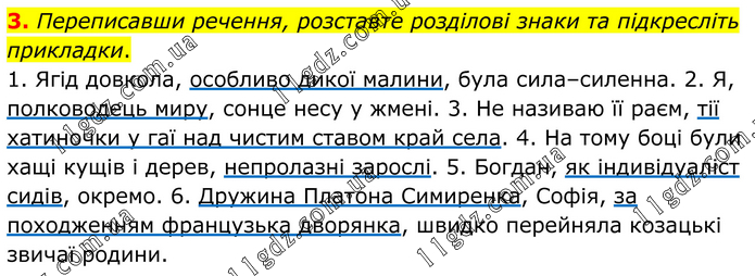 Переписавши речення, розставте розділові знаки та підкресліть прикладки. 1. Ягід довкола, особливо дикої малини, була сила–силенна. 2. Я, полководець миру, сонце несу у жмені. 3. Не називаю її раєм, тії хатиночки у гаї над чистим ставом край села. 4. На тому боці були хащі кущів і дерев, непролазні зарослі. 5. Богдан, як індивідуаліст сидів, окремо. 6. Дружина Платона Симиренка, Софія, за походженням французька дворянка, швидко перейняла козацькі звичаї родини.