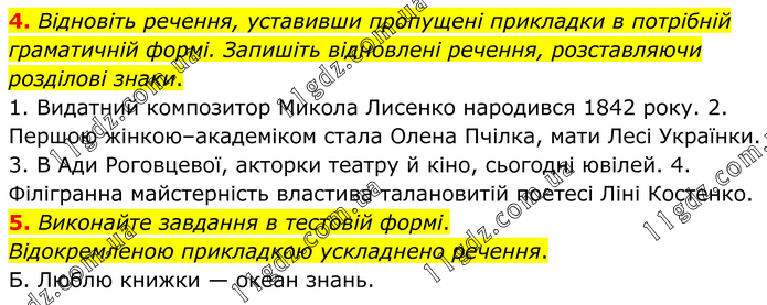 4. Відновіть речення, уставивши пропущені прикладки в потрібній граматичній формі. Запишіть відновлені речення, розставляючи розділові знаки. 1. Видатний композитор Микола Лисенко народився 1842 року. 2. Першою жінкою–академіком стала Олена Пчілка, мати Лесі Українки. 3. В Ади Роговцевої, акторки театру й кіно, сьогодні ювілей. 4. Філігранна майстерність властива талановитій поетесі Ліні Костенко. 5. Виконайте завдання в тестовій формі. Відокремленою прикладкою ускладнено речення. Б. Люблю книжки — океан знань.