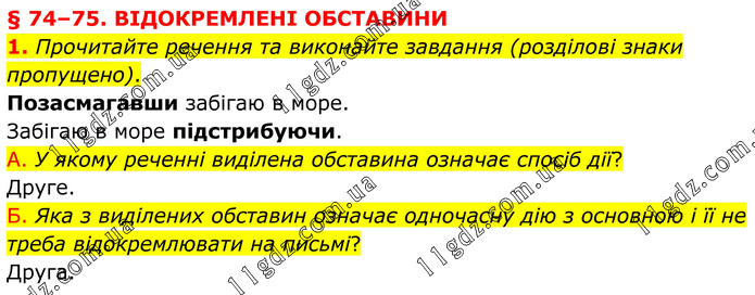 § 74–75. ВІДОКРЕМЛЕНІ ОБСТАВИНИ 1. Прочитайте речення та виконайте завдання (розділові знаки пропущено). Позасмагавши забігаю в море. Забігаю в море підстрибуючи. А. У якому реченні виділена обставина означає спосіб дії? Друге. Б. Яка з виділених обставин означає одночасну дію з основною і її не треба відокремлювати на письмі? Друга.