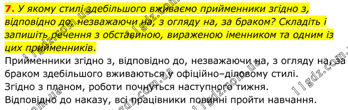7. У якому стилі здебільшого вживаємо прийменники згідно з, відповідно до, незважаючи на, з огляду на, за браком? Складіть і запишіть речення з обставиною, вираженою іменником та одним із цих прийменників. Прийменники згідно з, відповідно до, незважаючи на, з огляду на, за браком здебільшого вживаються у офіційно–діловому стилі. Згідно з планом, роботи почнуться наступного тижня. Відповідно до наказу, всі працівники повинні пройти навчання.