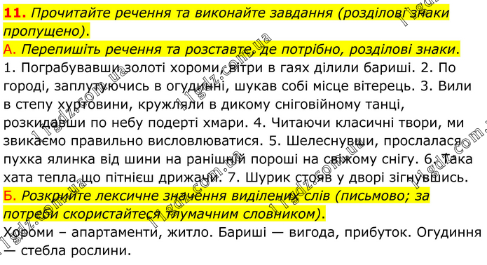 Прочитайте речення та виконайте завдання (розділові знаки пропущено). А. Перепишіть речення та розставте, де потрібно, розділові знаки. 1. Пограбувавши золоті хороми, вітри в гаях ділили бариші. 2. По городі, заплутуючись в огудинні, шукав собі місце вітерець. 3. Вили в степу хуртовини, кружляли в дикому сніговійному танці, розкидавши по небу подерті хмари. 4. Читаючи класичні твори, ми звикаємо правильно висловлюватися. 5. Шелеснувши, прослалася пухка ялинка від шини на ранішній пороші на свіжому снігу. 6. Така хата тепла що пітнієш дрижачи. 7. Шурик стояв у дворі зігнувшись. Б. Розкрийте лексичне значення виділених слів (письмово; за потреби скористайтеся тлумачним словником). Хороми – апартаменти, житло. Бариші — вигода, прибуток. Огудиння — стебла рослини.