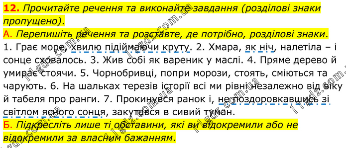 Прочитайте речення та виконайте завдання (розділові знаки пропущено). А. Перепишіть речення та розставте, де потрібно, розділові знаки. 1. Грає море, хвилю підіймаючи круту. 2. Хмара, як ніч, налетіла – і сонце сховалось. 3. Жив собі як вареник у маслі. 4. Пряме дерево й умирає стоячи. 5. Чорнобривці, попри морози, стоять, сміються та чарують. 6. На шальках терезів історії всі ми рівні незалежно від віку й табеля про ранги. 7. Прокинувся ранок і, не поздоровкавшись зі світлом ясного сонця, закутався в сивий туман. Б. Підкресліть лише ті обставини, які ви відокремили або не відокремили за власним бажанням.