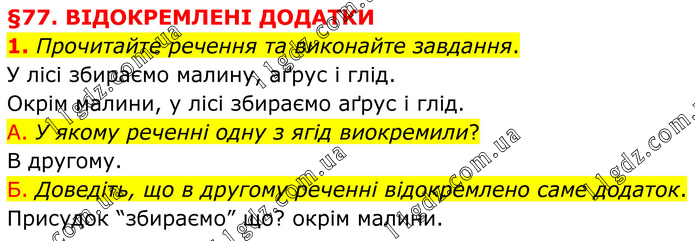 §77. ВІДОКРЕМЛЕНІ ДОДАТКИ 1. Прочитайте речення та виконайте завдання. У лісі збираємо малину, аґрус і глід. Окрім малини, у лісі збираємо аґрус і глід. А. У якому реченні одну з ягід виокремили? В другому. Б. Доведіть, що в другому реченні відокремлено саме додаток. Присудок “збираємо” що? окрім малини.