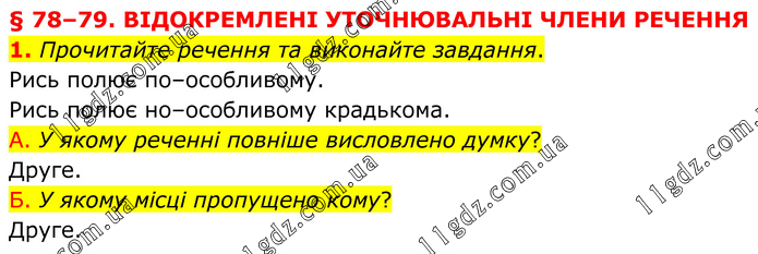 § 78–79. ВІДОКРЕМЛЕНІ УТОЧНЮВАЛЬНІ ЧЛЕНИ РЕЧЕННЯ 1. Прочитайте речення та виконайте завдання. Рись полює по–особливому. Рись полює но–особливому крадькома. А. У якому реченні повніше висловлено думку? Друге. Б. У якому місці пропущено кому? Друге.