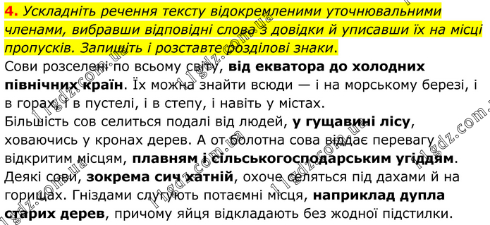 Ускладніть речення тексту відокремленими уточнювальними членами, вибравши відповідні слова з довідки й уписавши їх на місці пропусків. Запишіть і розставте розділові знаки. Сови розселені по всьому світу, від екватора до холодних північних країн. Їх можна знайти всюди — і на морському березі, і в горах, і в пустелі, і в степу, і навіть у містах. Більшість сов селиться подалі від людей, у гущавині лісу, ховаючись у кронах дерев. А от болотна сова віддає перевагу відкритим місцям, плавням і сільськогосподарським угіддям. Деякі сови, зокрема сич хатній, охоче селяться під дахами й на горищах. Гніздами слугують потаємні місця, наприклад дупла старих дерев, причому яйця відкладають без жодної підстилки.
