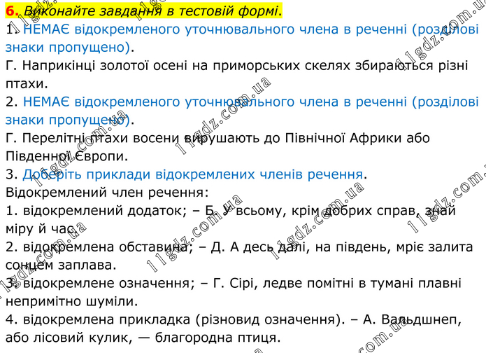Виконайте завдання в тестовій формі. 1. НЕМАЄ відокремленого уточнювального члена в реченні (розділові знаки пропущено). Г. Наприкінці золотої осені на приморських скелях збираються різні птахи. 2. НЕМАЄ відокремленого уточнювального члена в реченні (розділові знаки пропущено). Г. Перелітні птахи восени вирушають до Північної Африки або Південної Європи. 3. Доберіть приклади відокремлених членів речення. Відокремлений член речення: 1. відокремлений додаток; – Б. У всьому, крім добрих справ, знай міру й час. 2. відокремлена обставина; – Д. А десь далі, на південь, мріє залита сонцем заплава. 3. відокремлене означення; – Г. Сірі, ледве помітні в тумані плавні непримітно шуміли. 4. відокремлена прикладка (різновид означення). – А. Вальдшнеп, або лісовий кулик, — благородна птиця.