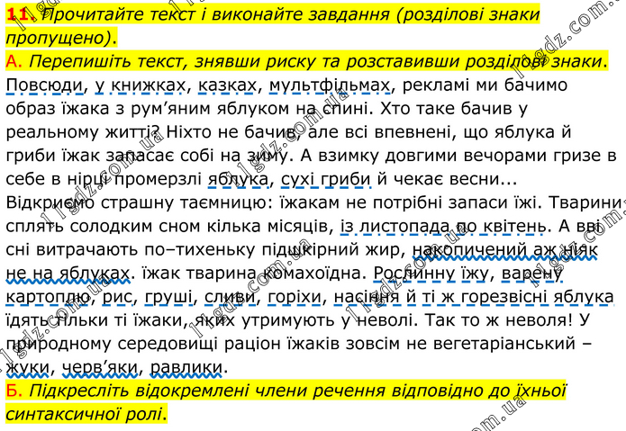 Прочитайте текст і виконайте завдання (розділові знаки пропущено). А. Перепишіть текст, знявши риску та розставивши розділові знаки. Повсюди, у книжках, казках, мультфільмах, рекламі ми бачимо образ їжака з рум’яним яблуком на спині. Хто таке бачив у реальному житті? Ніхто не бачив, але всі впевнені, що яблука й гриби їжак запасає собі на зиму. А взимку довгими вечорами гризе в себе в нірці промерзлі яблука, сухі гриби й чекає весни... Відкриємо страшну таємницю: їжакам не потрібні запаси їжі. Тварини сплять солодким сном кілька місяців, із листопада по квітень. А вві сні витрачають по–тихеньку підшкірний жир, накопичений аж ніяк не на яблуках. їжак тварина комахоїдна. Рослинну їжу, варену картоплю, рис, груші, сливи, горіхи, насіння й ті ж горезвісні яблука їдять тільки ті їжаки, яких утримують у неволі. Так то ж неволя! У природному середовищі раціон їжаків зовсім не вегетаріанський – жуки, черв’яки, равлики. Б. Підкресліть відокремлені члени речення відповідно до їхньої синтаксичної ролі.