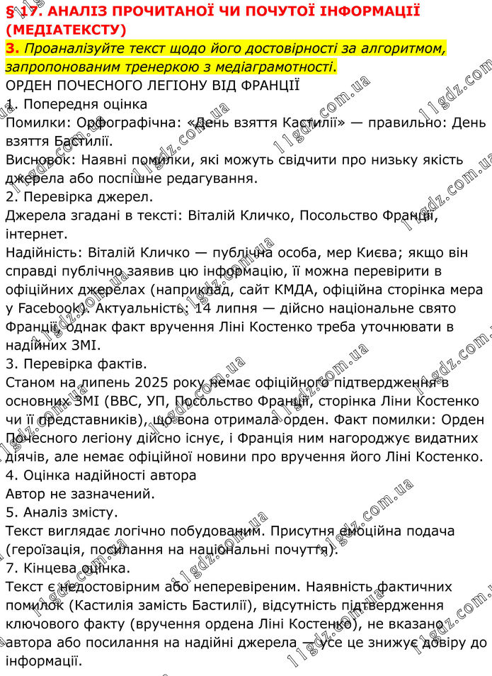 § 17. АНАЛІЗ ПРОЧИТАНОЇ ЧИ ПОЧУТОЇ ІНФОРМАЦІЇ (МЕДІАТЕКСТУ) 3. Проаналізуйте текст щодо його достовірності за алгоритмом, запропонованим тренеркою з медіаграмотності. ОРДЕН ПОЧЕСНОГО ЛЕГІОНУ ВІД ФРАНЦІЇ 1. Попередня оцінка Помилки: Орфографічна: «День взяття Кастилії» — правильно: День взяття Бастилії. Висновок: Наявні помилки, які можуть свідчити про низьку якість джерела або поспішне редагування. 2. Перевірка джерел. Джерела згадані в тексті: Віталій Кличко, Посольство Франції, інтернет. Надійність: Віталій Кличко — публічна особа, мер Києва; якщо він справді публічно заявив цю інформацію, її можна перевірити в офіційних джерелах (наприклад, сайт КМДА, офіційна сторінка мера у Facebook). Актуальність: 14 липня — дійсно національне свято Франції, однак факт вручення Ліні Костенко треба уточнювати в надійних ЗМІ. 3. Перевірка фактів. Станом на липень 2025 року немає офіційного підтвердження в основних ЗМІ (BBC, УП, Посольство Франції, сторінка Ліни Костенко чи її представників), що вона отримала орден. Факт помилки: Орден Почесного легіону дійсно існує, і Франція ним нагороджує видатних діячів, але немає офіційної новини про вручення його Ліні Костенко. 4. Оцінка надійності автора Автор не зазначений. 5. Аналіз змісту. Текст виглядає логічно побудованим. Присутня емоційна подача (героїзація, посилання на національні почуття). 7. Кінцева оцінка. Текст є недостовірним або неперевіреним. Наявність фактичних помилок (Кастилія замість Бастилії), відсутність підтвердження ключового факту (вручення ордена Ліні Костенко), не вказано автора або посилання на надійні джерела — усе це знижує довіру до інформації.