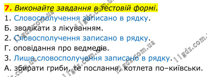 7. Виконайте завдання в тестовій формі. 1. Словосполучення записано в рядку. Б. зволікати з лікуванням. 2. Словосполучення записано в рядку. Г. оповідання про ведмедів. 3. Лише словосполучення записано в рядку. А. збирати гриби, те послання, котлета по–київськи.