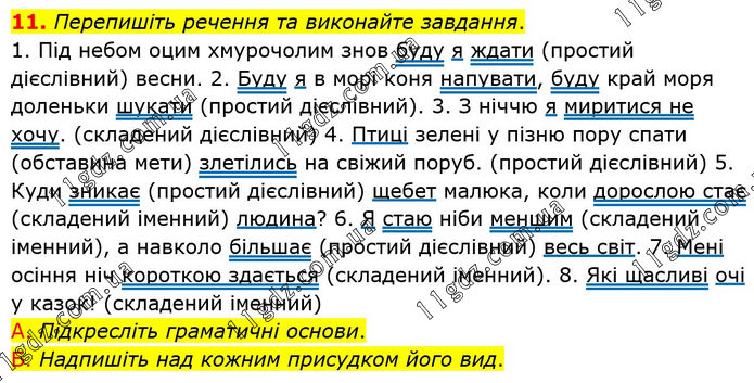 11. Перепишіть речення та виконайте завдання. 1. Під небом оцим хмурочолим знов буду я ждати (простий дієслівний) весни. 2. Буду я в морі коня напувати, буду край моря доленьки шукати (простий дієслівний). 3. З ніччю я миритися не хочу. (складений дієслівний) 4. Птиці зелені у пізню пору спати (обставина мети) злетілись на свіжий поруб. (простий дієслівний) 5. Куди зникає (простий дієслівний) щебет малюка, коли дорослою стає (складений іменний) людина? 6. Я стаю ніби меншим (складений іменний), а навколо більшає (простий дієслівний) весь світ. 7. Мені осіння ніч короткою здається (складений іменний). 8. Які щасливі очі у казок! (складений іменний) А. Підкресліть граматичні основи. Б. Надпишіть над кожним присудком його вид.