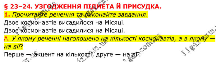 § 23–24. УЗГОДЖЕННЯ ПІДМЕТА Й ПРИСУДКА. 1. Прочитайте речення та виконайте завдання. Двоє космонавтів висадилося на Місяці. Двоє космонавтів висадилися на Місяці. А. У якому реченні наголошено на кількості космонавтів, а в якому — на дії? Перше — акцент на кількості, друге — на дії.