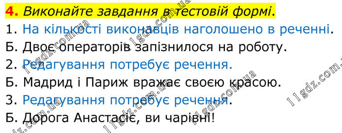 4. Виконайте завдання в тестовій формі. 1. На кількості виконавців наголошено в реченні. Б. Двоє операторів запізнилося на роботу. 2. Редагування потребує речення. Б. Мадрид і Париж вражає своєю красою. 3. Редагування потребує речення. Б. Дорога Анастасіє, ви чарівні!