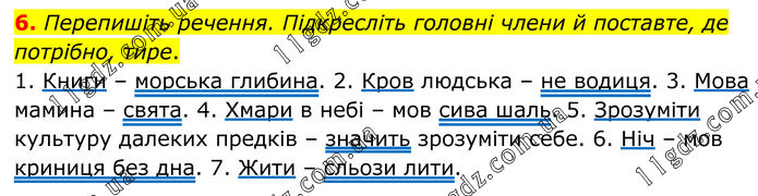 6. Перепишіть речення. Підкресліть головні члени й поставте, де потрібно, тире. 1. Книги – морська глибина. 2. Кров людська – не водиця. 3. Мова мамина – свята. 4. Хмари в небі – мов сива шаль. 5. Зрозуміти культуру далеких предків – значить зрозуміти себе. 6. Ніч – мов криниця без дна. 7. Жити – сльози лити.