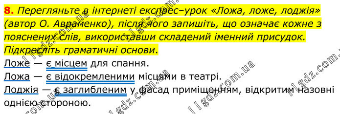 8. Перегляньте в інтернеті експрес–урок «Ложа, ложе, лоджія» (автор О. Авраменко), після чого запишіть, що означає кожне з пояснених слів, використавши складений іменний присудок. Підкресліть граматичні основи. Ложе — є місцем для спання. Ложа — є відокремленими місцями в театрі. Лоджія — є заглибленим у фасад приміщенням, відкритим назовні однією стороною.