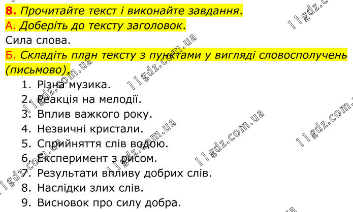 8. Прочитайте текст і виконайте завдання. А. Доберіть до тексту заголовок. Сила слова. Б. Складіть план тексту з пунктами у вигляді словосполучень (письмово). 1. Різна музика. 2. Реакція на мелодії. 3. Вплив важкого року. 4. Незвичні кристали. 5. Сприйняття слів водою. 6. Експеримент з рисом. 7. Результати впливу добрих слів. 8. Наслідки злих слів. 9. Висновок про силу добра.