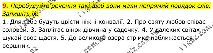 9. Перебудуйте речення так, щоб вони мали непрямий порядок слів. Запишіть їх. 1. Для тебе будуть цвісти ніжні конвалії. 2. Про святу любов співає соловей. 3. Заплітає вінок дівчина у садочку. 4. У далеких світах шукай своє щастя. 5. До великого озера стрімко наближається вершник.