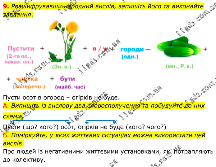 9. Розшифрувавши народний вислів, запишіть його та виконайте завдання. Пусти осот в огород – огірків не буде. А. Випишіть із вислову два словосполучення та побудуйте до них схеми. Пусти (що? кого?) осот, огірків не буде (кого? чого?) Б. Поміркуйте, у яких життєвих ситуаціях можна використати цей вислів. Про людей із негативними життєвими установками, які потрапляють до колективу.