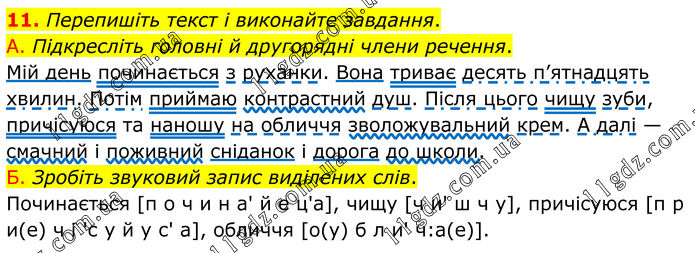 11. Перепишіть текст і виконайте завдання. А. Підкресліть головні й другорядні члени речення. Мій день починається з руханки. Вона триває десять п’ятнадцять хвилин. Потім приймаю контрастний душ. Після цього чищу зуби, причісуюся та наношу на обличчя зволожувальний крем. А далі — смачний і поживний сніданок і дорога до школи. Б. Зробіть звуковий запис виділених слів. Починається [п о ч и н а' й е ц'а], чищу [ч и' ш ч у], причісуюся [п р и(е) ч і 'с у й у с' а], обличчя [о(у) б л и' ч:а(е)].