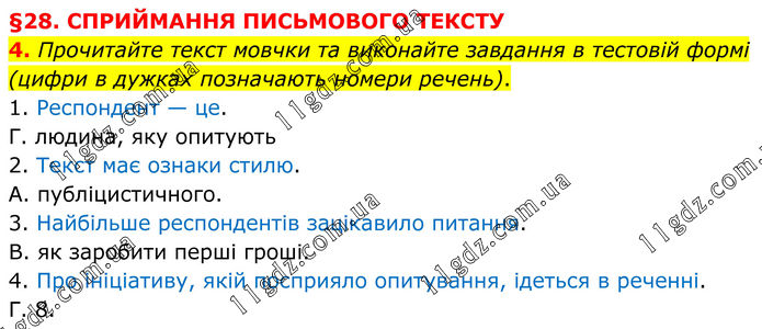 §28. СПРИЙМАННЯ ПИСЬМОВОГО ТЕКСТУ 4. Прочитайте текст мовчки та виконайте завдання в тестовій формі (цифри в дужках позначають номери речень). 1. Респондент — це. Г. людина, яку опитують 2. Текст має ознаки стилю. А. публіцистичного. 3. Найбільше респондентів зацікавило питання. В. як заробити перші гроші. 4. Про ініціативу, якій посприяло опитування, ідеться в реченні. Г. 8.