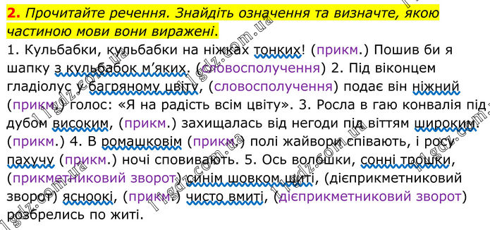 2. Прочитайте речення. Знайдіть означення та визначте, якою частиною мови вони виражені. 1. Кульбабки, кульбабки на ніжках тонких! (прикм.) Пошив би я шапку з кульбабок м’яких. (словосполучення) 2. Під віконцем гладіолус у багряному цвіту, (словосполучення) подає він ніжний (прикм.) голос: «Я на радість всім цвіту». 3. Росла в гаю конвалія під дубом високим, (прикм.) захищалась від негоди під віттям широким. (прикм.) 4. В ромашковім (прикм.) полі жайвори співають, і росу пахучу (прикм.) ночі сповивають. 5. Ось волошки, сонні трошки, (прикметниковий зворот) синім шовком шиті, (дієприкметниковий зворот) ясноокі, (прикм.) чисто вмиті, (дієприкметниковий зворот) розбрелись по житі.