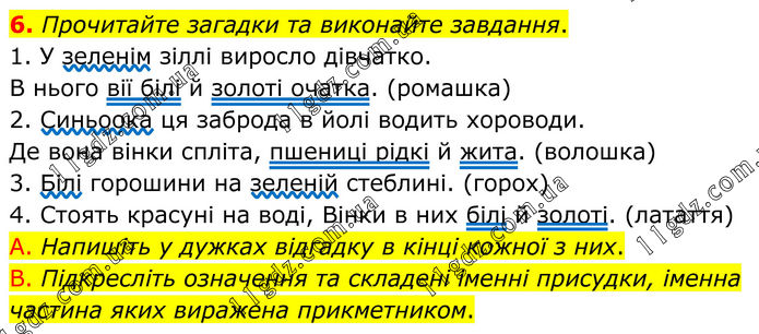 6. Прочитайте загадки та виконайте завдання. 1. У зеленім зіллі виросло дівчатко. В нього вії білі й золоті очатка. (ромашка) 2. Синьоока ця заброда в йолі водить хороводи. Де вона вінки спліта, пшениці рідкі й жита. (волошка) 3. Білі горошини на зеленій стеблині. (горох) 4. Стоять красуні на воді, Вінки в них білі й золоті. (латаття) A. Напишіть у дужках відгадку в кінці кожної з них. B. Підкресліть означення та складені іменні присудки, іменна частина яких виражена прикметником.
