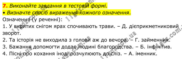 7. Виконайте завдання в тестовій формі. • Визначте спосіб вираження кожного означення. Означення (у реченні): 1. У вкритих снігом ярах спочивають трави. – Д. дієприкметниковий зворот. 2. Та історія не виходила з голови аж до вечора. – Г. займенник. 3. Бажання допомогти додає людині благородства. – Б. інфінітив. 4. Пісні про кохання іноді розчулюють до сліз. – А. іменник.