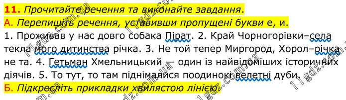 11. Прочитайте речення та виконайте завдання. А. Перепишіть речення, уставивши пропущені букви е, и. 1. Проживав у нас довго собака Пірат. 2. Край Чорногорівки–села текла мого дитинства річка. 3. Не той тепер Миргород, Хорол–річка не та. 4. Гетьман Хмельницький — один із найвідоміших історичних діячів. 5. То тут, то там піднімалися поодинокі велетні дуби. Б. Підкресліть прикладки хвилястою лінією.