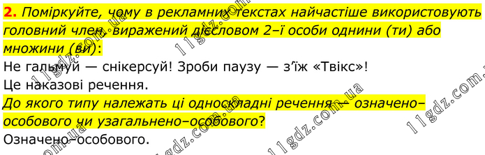 Поміркуйте, чому в рекламних текстах найчастіше використовують головний член, виражений дієсловом 2–ї особи однини (ти) або множини (ви): Не гальмуй — снікерсуй! Зроби паузу — з’їж «Твікс»! Це наказові речення. До якого типу належать ці односкладні речення — означено–особового чи узагальнено–особового? Означено–особового.