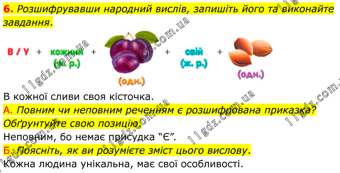 6. Розшифрувавши народний вислів, запишіть його та виконайте завдання. В кожної сливи своя кісточка. А. Повним чи неповним реченням є розшифрована приказка? Обґрунтуйте свою позицію. Неповним, бо немає присудка “Є”. Б. Поясніть, як ви розумієте зміст цього вислову. Кожна людина унікальна, має свої особливості.
