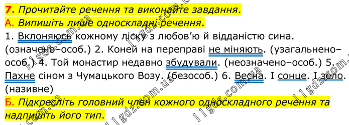 Прочитайте речення та виконайте завдання. А. Випишіть лише односкладні речення. 1. Вклоняюсь кожному ліску з любов’ю й відданістю сина. (означено–особ.) 2. Коней на переправі не міняють. (узагальнено–особ.) 4. Той монастир недавно збудували. (неозначено–особ.) 5. Пахне сіном з Чумацького Возу. (безособ.) 6. Весна. І сонце. І зело. (називне) Б. Підкресліть головний член кожного односкладного речення та надпишіть його тип.