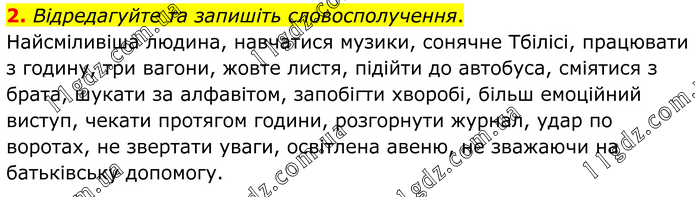 Відредагуйте та запишіть словосполучення. Найсміливіша людина, навчатися музики, сонячне Тбілісі, працювати з годину, три вагони, жовте листя, підійти до автобуса, сміятися з брата, шукати за алфавітом, запобігти хворобі, більш емоційний виступ, чекати протягом години, розгорнути журнал, удар по воротах, не звертати уваги, освітлена авеню, не зважаючи на батьківську допомогу.