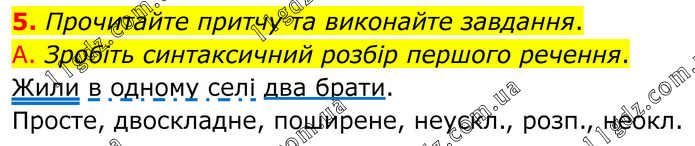 Прочитайте притчу та виконайте завдання. А. Зробіть синтаксичний розбір першого речення. Жили в одному селі два брати. Просте, двоскладне, поширене, неускл., розп., неокл.