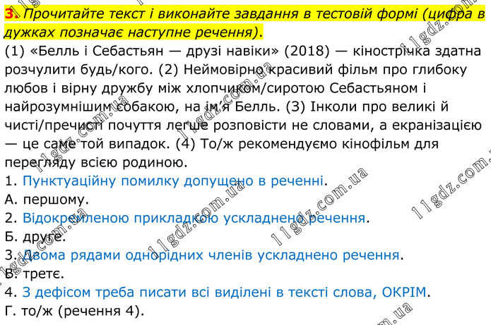 Прочитайте текст і виконайте завдання в тестовій формі (цифра в дужках позначає наступне речення). (1) «Белль і Себастьян — друзі навіки» (2018) — кінострічка здатна розчулити будь/кого. (2) Неймовірно красивий фільм про глибоку любов і вірну дружбу між хлопчиком/сиротою Себастьяном і найрозумнішим собакою, на ім’я Белль. (З) Інколи про великі й чисті/пречисті почуття легше розповісти не словами, а екранізацією — це саме той випадок. (4) То/ж рекомендуємо кінофільм для перегляду всією родиною. 1. Пунктуаційну помилку допущено в реченні. А. першому. 2. Відокремленою прикладкою ускладнено речення. Б. друге. 3. Двома рядами однорідних членів ускладнено речення. В. третє. 4. З дефісом треба писати всі виділені в тексті слова, ОКРІМ. Г. то/ж (речення 4).